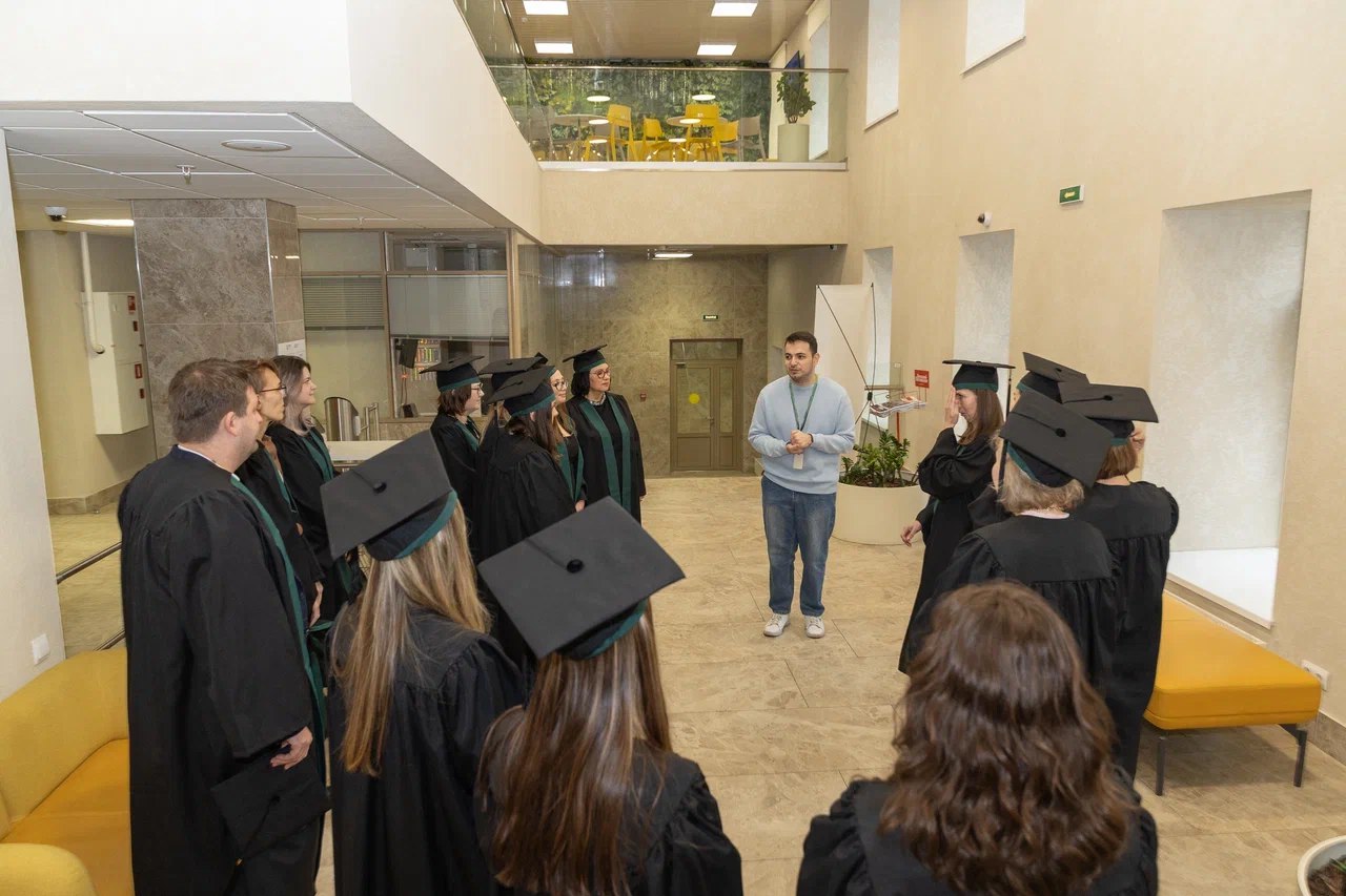 Встреча началась с экскурсии по обновлённому корпусу, которую провёл Тамерлан Туганов, ответственный по работе с молодёжью и выпускниками ИПМЭиТ. Гости осмотрели современные аудитории, конференц-залы, зоны коворкинга и Музей истории торгового дела, где на старых фотографиях узнавали своих преподавателей и ректора — профессора Виталия Андреевича Гуляева.